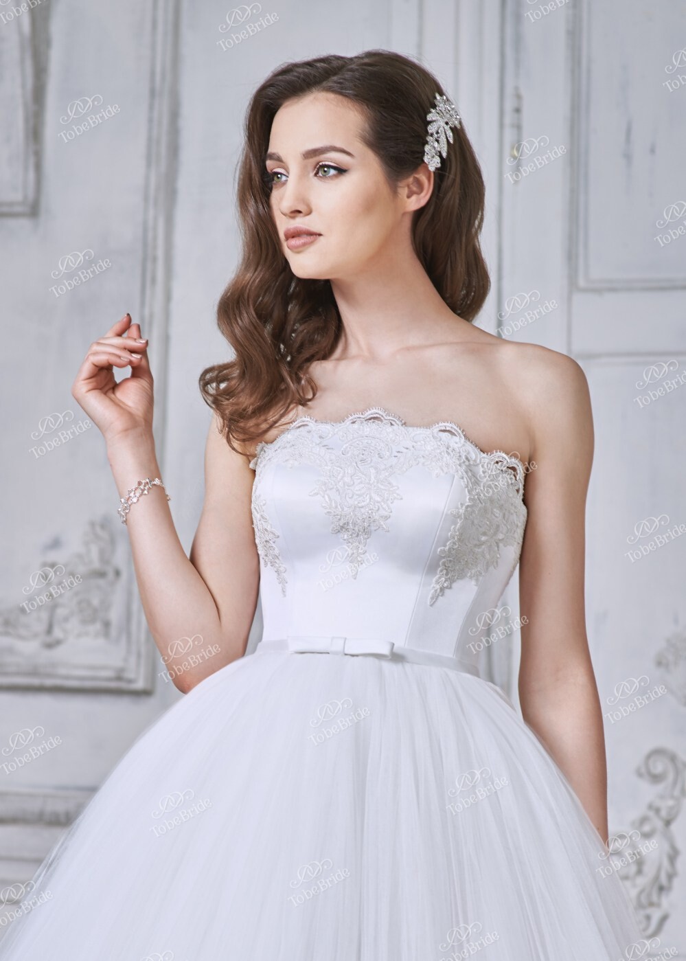 Длинное пышное свадебное платье из фатина и атласа. Верх корсета и низ юбка украшен кружевом. Открытые плечи, корсет на шнуровке.